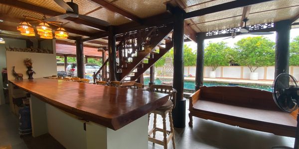 ที่ The Elephant House and Bungalows have two bars and two cooking areas. One that Rose cooks in one kitchen for guests to cook whatever they like. We have plenty of places to relax at the pool or at the bar/lounge